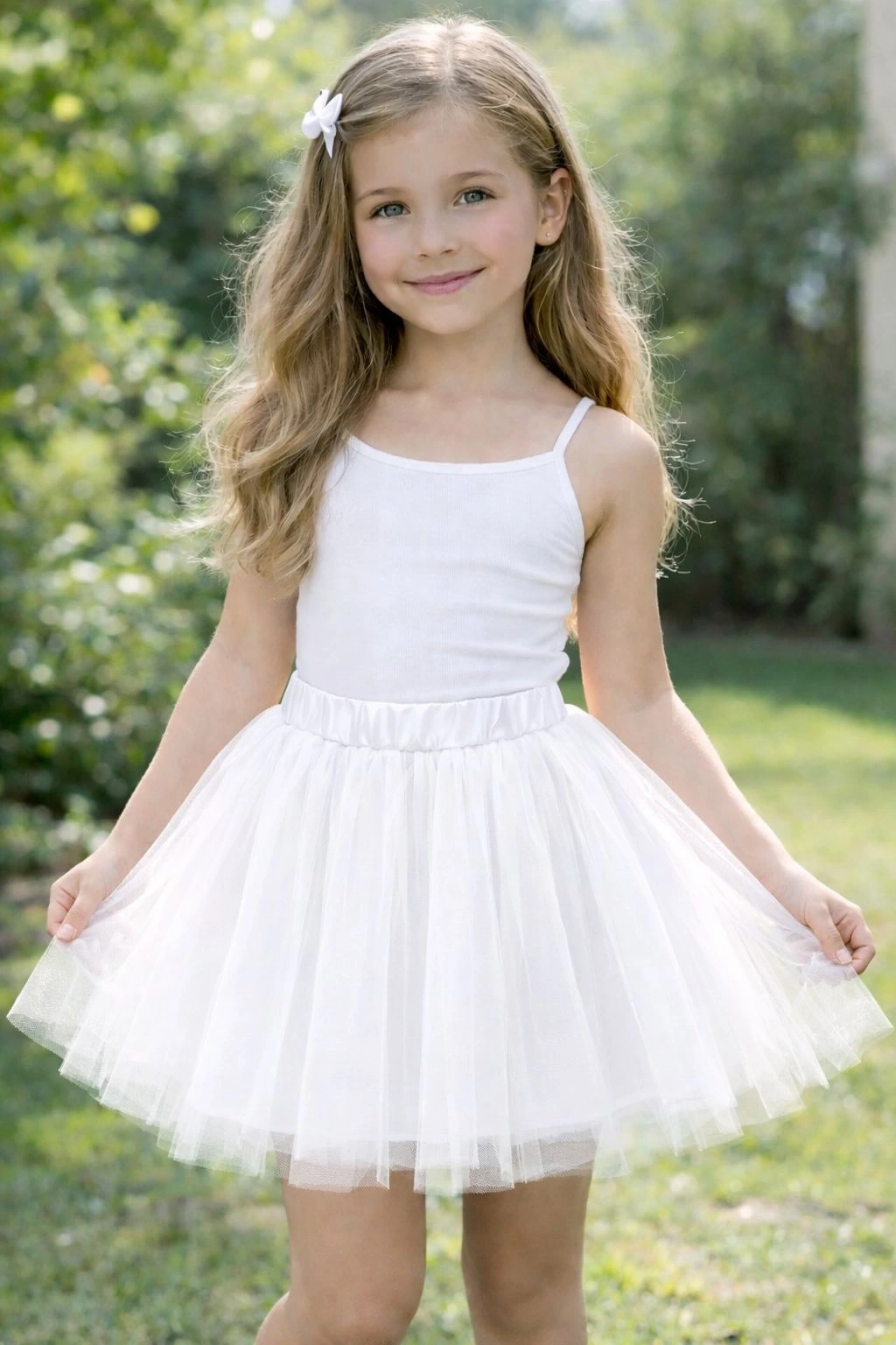 Minik prensesler için tasarlanan bu beyaz tütü etek, yumuşak dokusu ve kabarık formu ile hem günlük kullanıma hem de özel günlere uygundur.
